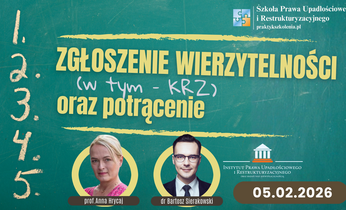 Zapraszamy do udziału w szkoleniu pt. "Zgłoszenie wierzytelności (w tym – KRZ) oraz potrącenie". Szkolenie poprowadzą dr hab. Anna Hrycaj oraz dr Bartosz Sierakowski.